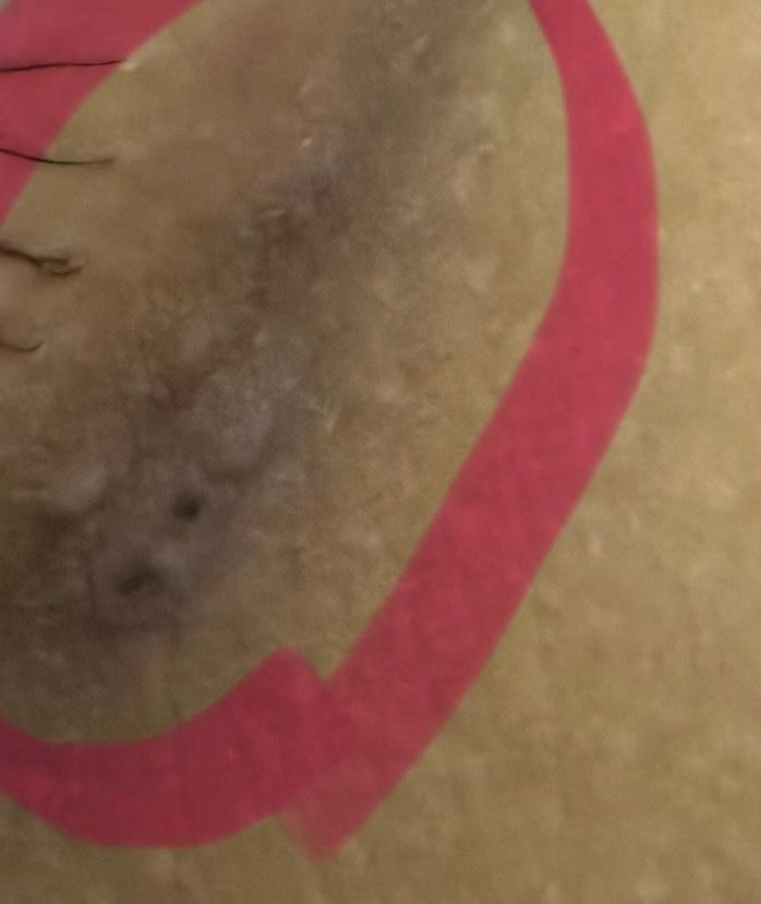 1. 긁음·마찰 후 생긴 출혈성 딱지/멍 섞인 색소침착.
