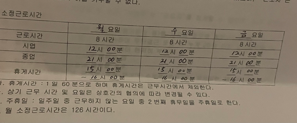 소정근로시간은 임의로 적어두어서 출근 일은 매주 달랐으나 입퇴사 기간동안 주 3일 8시간씩 24시간 근무 했습니다.