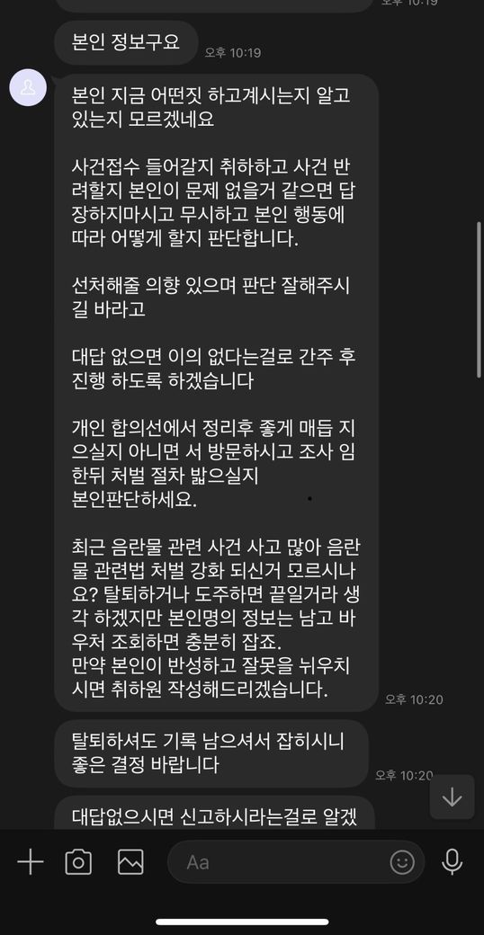 4. 하지만 여기서 돈을 주면 계속 요구당할 것 같아 돈은 주지않고 계속 돈이 없다며 시간을 끌었더니 상대는 결국 합의 의향 없으시죠? 라고 물어보더니 사이버범죄 신고/ 상담이 접수되었다는 사진을 보내고 저를 차단하겠다 이야기한후론 연락이 없습니다. (신고 접수가 좀 많이 걱정됩니다)