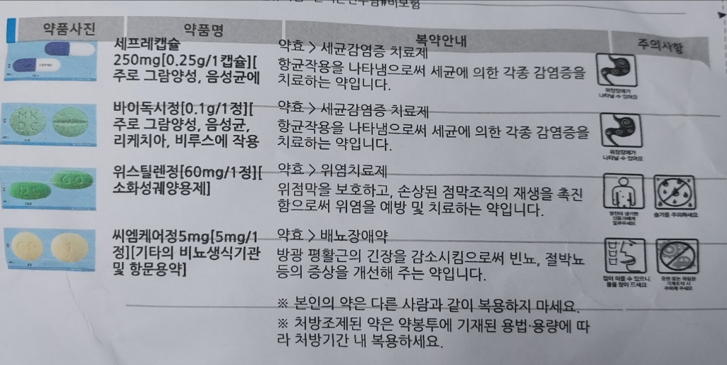 처방받은 약들의 경우 공복에 복용시에 위장에 자극감을 줄수 있기에 메스꺼움이 있는 경우 식후에 복용을 하길 권장드리며 유제품의 경우 항생제 흡수를방해할수 있기에 1시간 이상 시간차를 두길 권장드립니다.