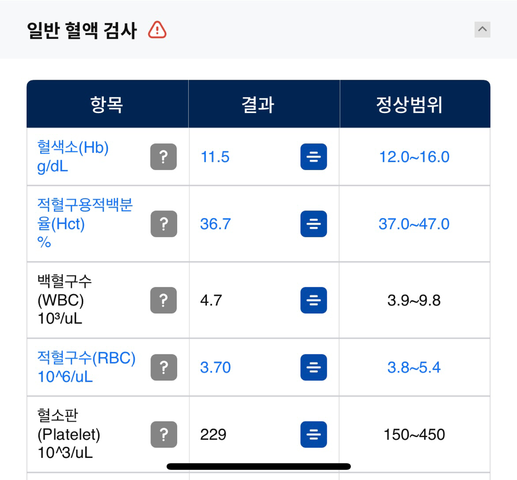 혈색소 등 수치가 정상 범위에 비해서 살짝 낮은 결과가 나왔습니다만, 딱히 걱정할 필요 없는 수치이며 이상이 있다고 볼 정도가 아닙니다. 따로 치료가 필요해 보이지 않으며 그냥 건강한 생활 습관을 유지하면 되겠습니다.