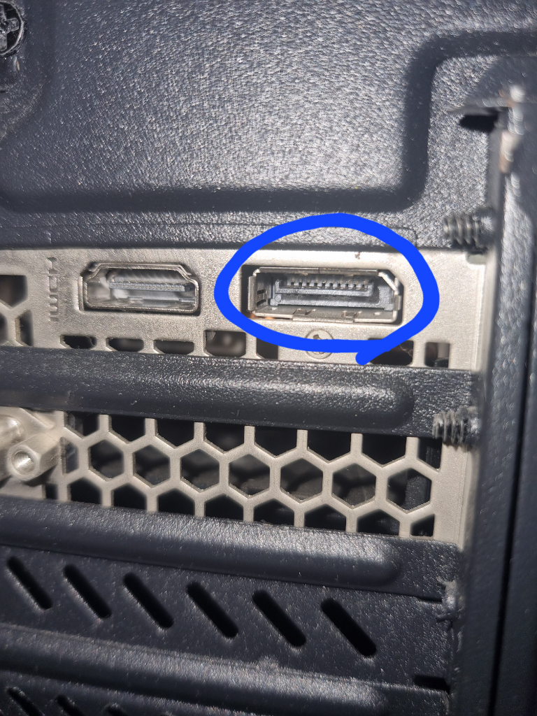 표시한 포트는 DP 케이블을 위한 포트 입니다. HDMI가 다양한 전자기기를 위해 제작된 반면 DP 케이블은 주로 PC에 최적화된 출력을 목적으로 제작 되었다고 합니다. 연결할 대상에 HDMI 포트 밖에 없다면 변환케이블을 별도로 구매해서 연결하시면 됩니다.