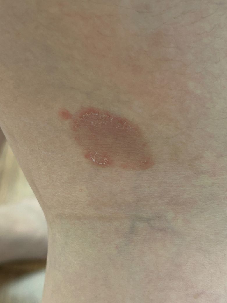 사진 소견상 경계가 비교적 뚜렷하고 가장자리에 각질(인설)이 동반된 홍반성 판 형태입니다. 중심부보다 가장자리가 더 활성화되어 보이고, 주변에 위성 병변처럼 작은 병변이 동반되어 있습니다. 임상적으로는 피부사상균 감염, 즉 체부백선 가능성이 가장 우선입니다.
