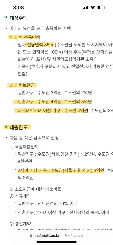 버팀목 전세자금대출을 받으려고 하는데요 노란색으 로 체크한 부분이 저랑 맞는 조건인데임차전용면적 85제곱미터, 임차보증금 수도권4억원, 대출한도는 3억원이라고 하면 85제곱미터이하, 4억원 이하의 집에 3억원까지 대출이 나온다는 말이 맞나요???
