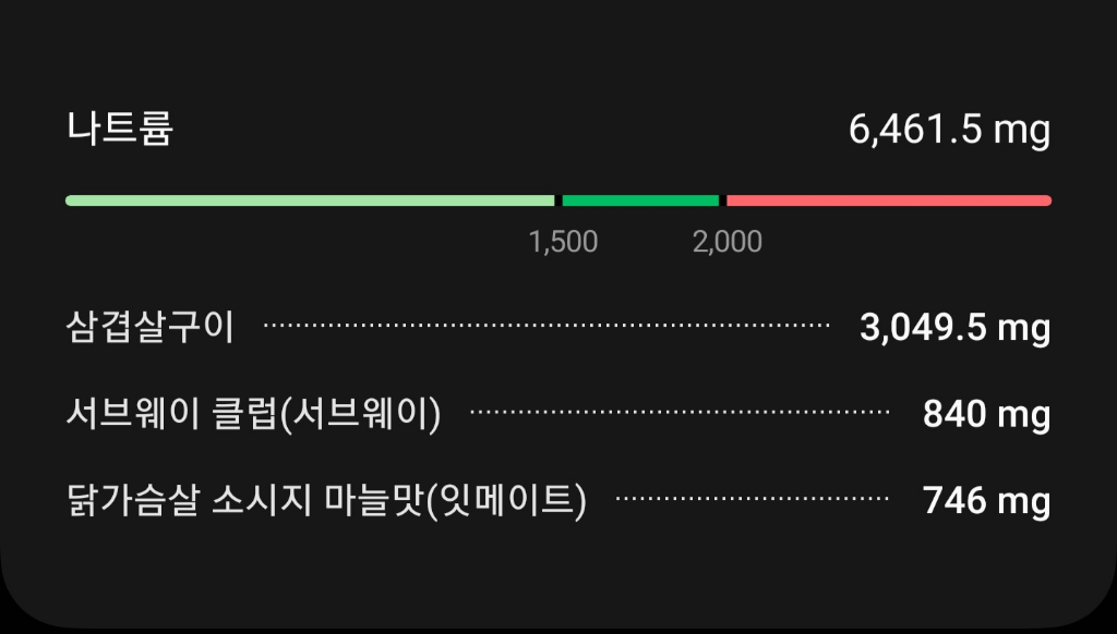 제가 식단이랑 영양소 맞춰볼려고 저녁 식단에 삼겹살을 넣어봤는데 나트륨이 핵폭탄급으로 추가가 되네요??;;;;;