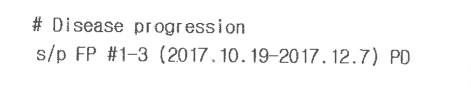 s/p FP #1-3 : 2017년 10월 19일부터 12월 7일까지 3차례 항암제를 투여하셨는데 FP는 5-Fluorouracil과 Cisplatin이라는 두 가지 항암제의 조합으로 투여했다는 것을 의미합니다. PD는 Progressive disease의 준말로 치료 이후에 약제의 효과가 좋지 못해 암이 진행했음을 의미합니다.