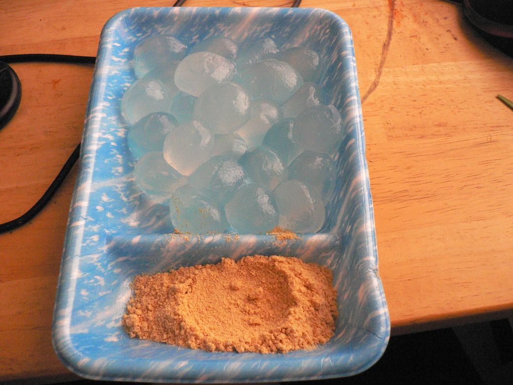 물방울떡이요 감자전분 흑설탕 설탕 세가지로 만든거에요 거기에 꿀이랑 저렇게 인절미 가루 묻혀서 먹어여