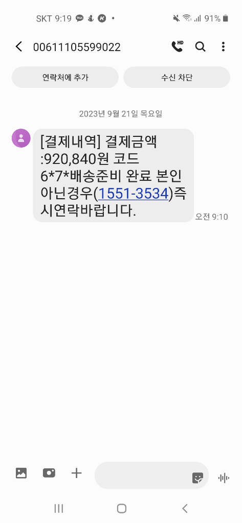 지금까지 정상적으로 상품 구매해서 구매관련 문자에서 위 문자처럼 전화번호 포함된 문자 받아 보신적 있나요?