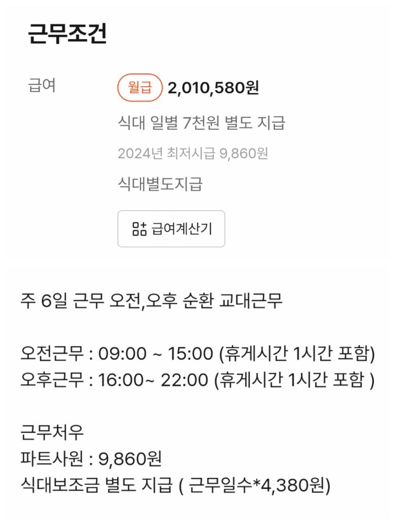 그렇다면 1주 근로시간은 30시간, 주휴시간 5시간하면 2024년 최저임금 기준으로 150만원정도가 나옵니다. 식대가 약 20만원 나온다고 치면 공고에 표기된 월급과는 내용이 다릅니다.