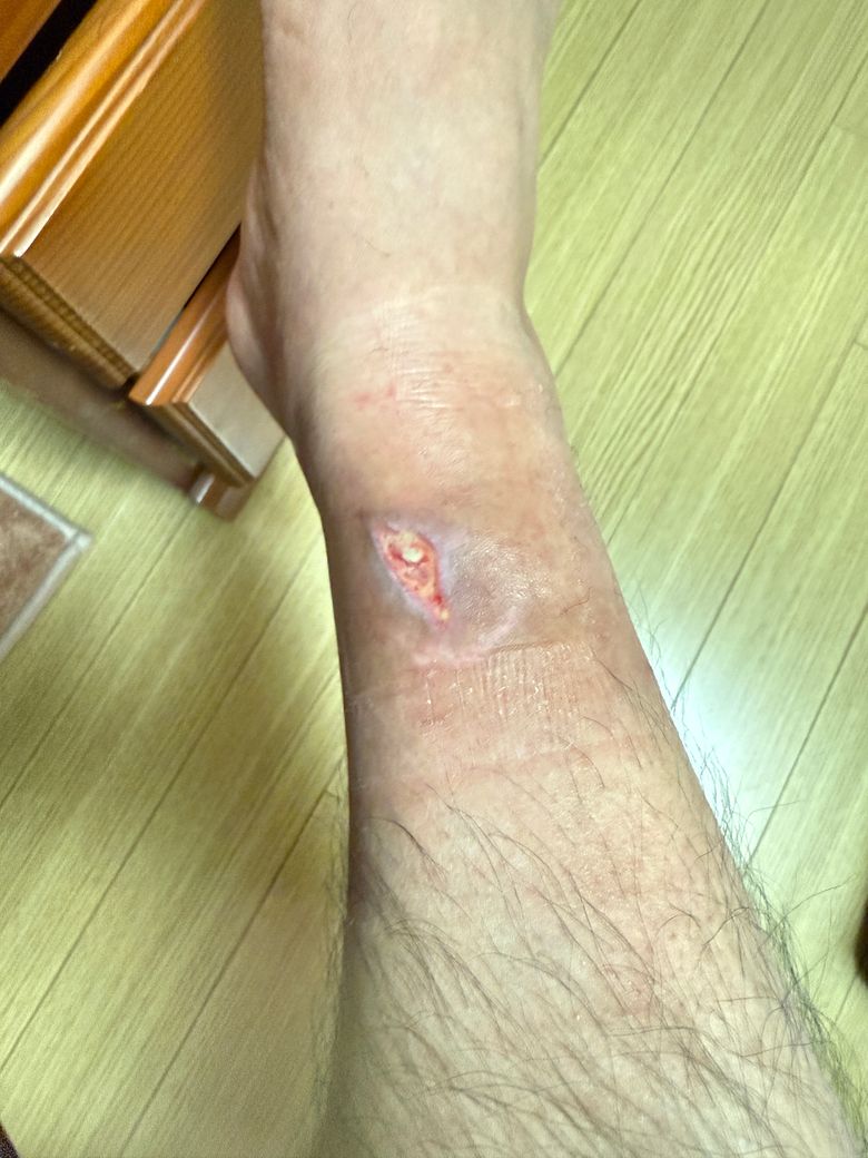 처음에는 상처 부위가 붉어서 잘 보이지 않았는데 지금 보니까 상처 부위 주변이 파란데, 이게 멍든 자국인가요 아님 괴사 초기 인가요?
