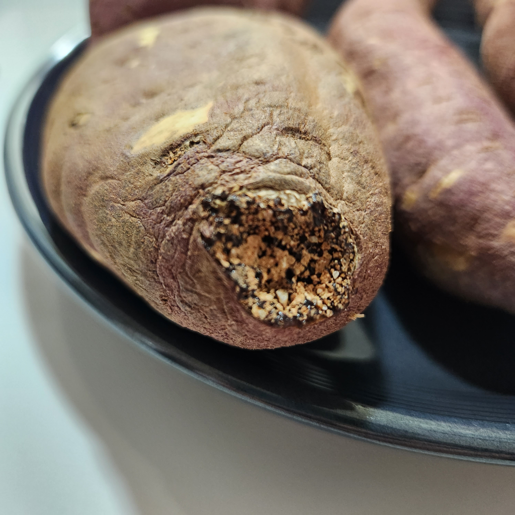 보통 고구마가 썩으면 바깥 껍질에 검은색으로 한 개 ~ 여러 개의 크고 작은 점들이 생깁니다. 보통은 도려낸 후에 드시는 분들이 마다합니다만, 잘라내도 병균이 고구마 전체에 퍼져있기 때문에 배탈, 복통이 날 수 있으니 아주 조금이라도 썩는 것 같은 증세가 보인다면 그냥 버리는 게 맞습니다.