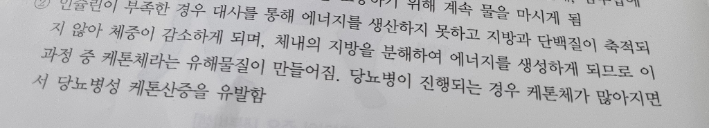 하지만 1형 당뇨병 환자의 경우 혈당이 높아졌음에도 불구하고 인슐린이 분비되는 기능에 장애가 있어 혈당이 세포내로 들어가지 못하고 오줌으로 배출되어버리고 당이외의 영양성분인 지방을 분해하여 대사에 이용하는 상태가 됩니다.