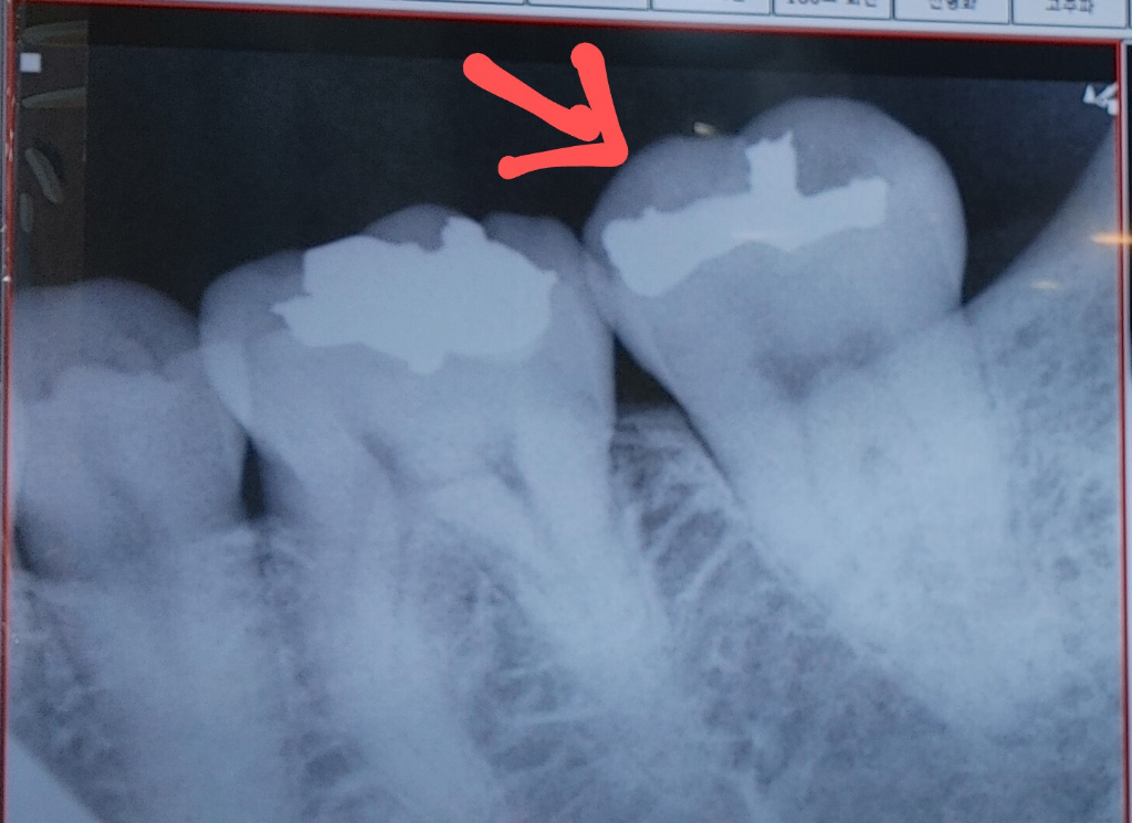 사진으로만 봤을 경우에는 큰 충치가 보이진 않습니다. 하지만 치아의 금이 같다거나 과도한 힘이 가해졌다면 치아가 실을 수 있기 때문에 치아에 가해지는 힘을 줄여보는 것이 좋습니다. 치아의 금이 갔다면 신경치료 후 크라운 치료가 필요할 수 있습니다. 자세한 확인을 위해서 치과에서 진료를 받아보는 것을 권유드립니다