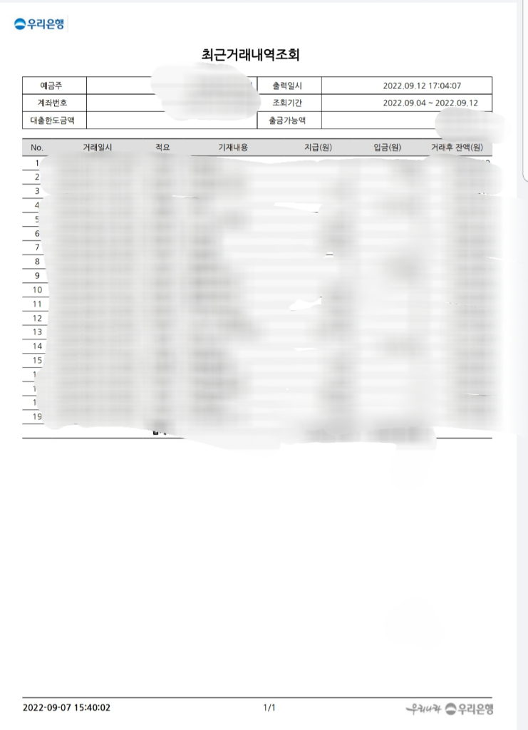 8일거래내역이 포함되어있는데 2022-09-07 15:40:02 출력은 말이 안되기때문에 해당 은행직원의 컴퓨터단말이나 프린트 날짜 세팅값에 문제가 있는것 같네요.