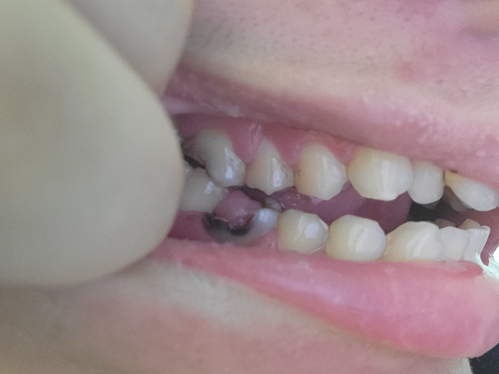 현재 상태가 치아가 많이 썩어 거의 다 없어진 상태입니다. 가능한 치과 가는 것이 좋습니다.
