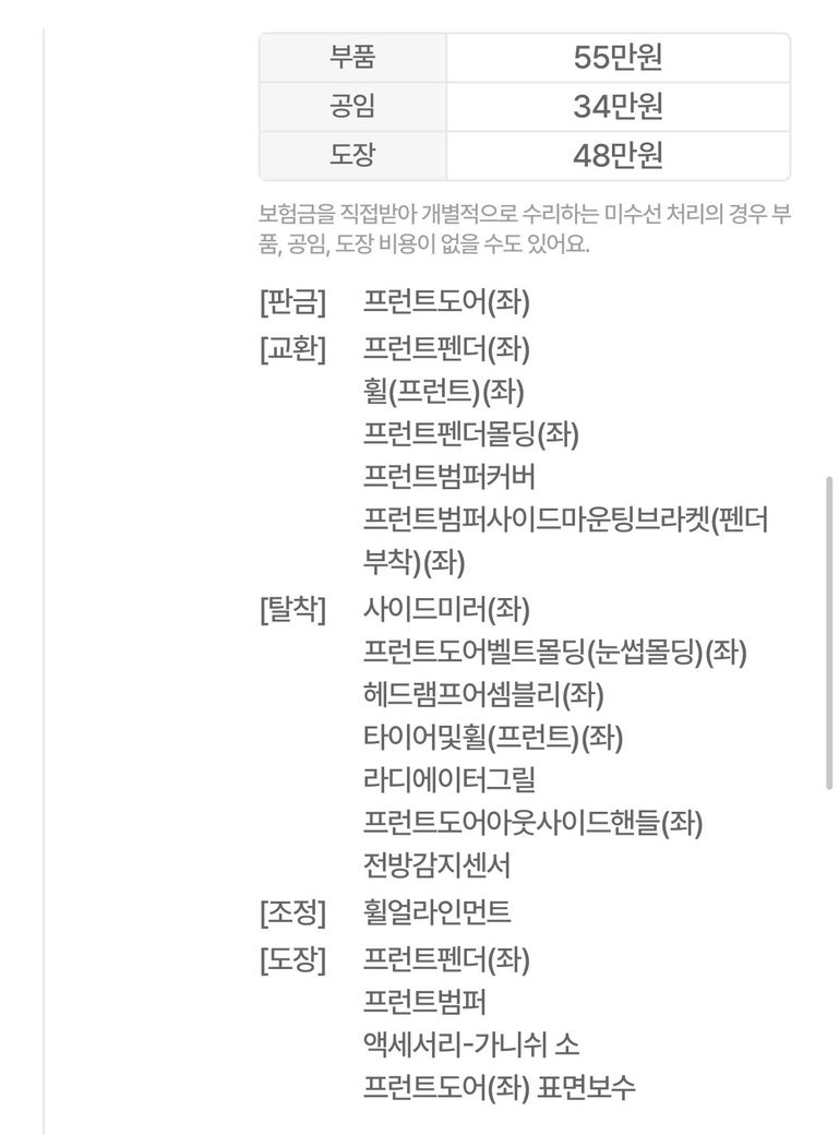 이 정도 이력이면 단순 접촉사고 수준을 넘어선 거라 조심하셔야 합니다. 교환 목록에 프런트 휀더, 휠, 도어뿐만 아니라 라디에이터 그릴과 각종 센서류까지 포함된 걸 보니 앞측면 충격이 꽤 컸던 차예요. 2,300만 원이라는 가격이 시세보다 저렴하더라도 휠얼라인먼트 조정 이력까지 있는 걸 보면 주행 밸런스에 문제가 생겼을 가능성도 배제 못 합니다. 겉만 보고 덥석 가져오시기보다는 성능점검기록부 상에 프레임(뼈대) 손상이 없는지 반드시 확인하시고, 가급적이면 이력 깨끗한 다른 차를 더 알아보시는 걸 권합니다. 이 가격대에 선택지는 많으니까요.
