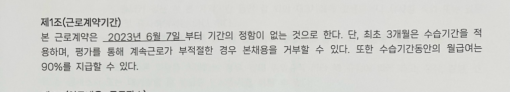 내용을 확인해보니, 수습기간의 월 급여에 대해서는 90% 지급으로 기재되어 있으므로