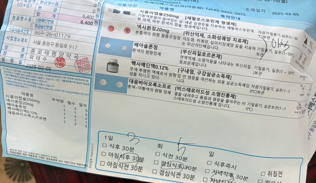 베아솔론정은 이틀동안만 먹는거라 4일차인 지금은 시클러캡슐, 넥시퀸정(아침약에만 포함), 대웅바이오록소프로펜 이렇게 들어있는데요.