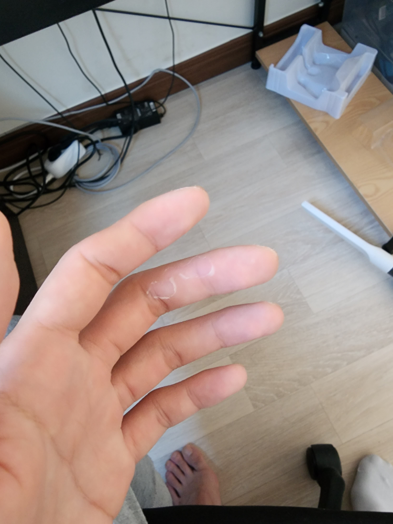 무거운 물건을 들거나 하시면서 손에 자극이 되고 밀리면서 피부가 벗겨지는 것으로 보입니다.