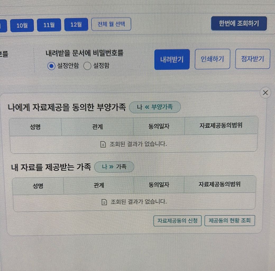 아래 사진 보다시피 부양가족이나 자료 제공받는 가족 없다고 나오는데