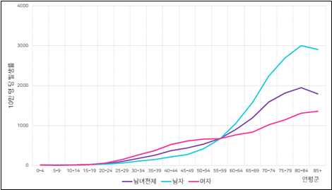 남자분의 경우를 보면 암발생률니 40-50대를 지나면서 많이 증가하는 것을 확인할 수 있습니다