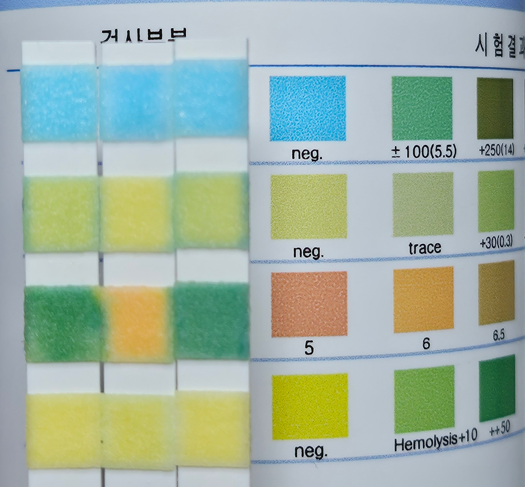 사진에서 보이는 검사지의 색깔은 'negative' (음성)와 'trace' (미량 양성) 사이에 위치하는 것으로 보입니다. 보통 'trace'는 매우 미량의 단백질이 소변에서 발견되었음을 의미하지만, 이는 정상 범위 내에서 발견될 수 있는 수준입니다. 하지만, 정확한 판독은 비교적 주관적일 수 있으며, 조명, 배경 색상, 해석하는 사람의 시각 등에 따라 달라질 수 있습니다.