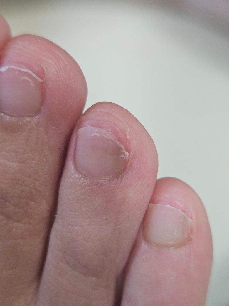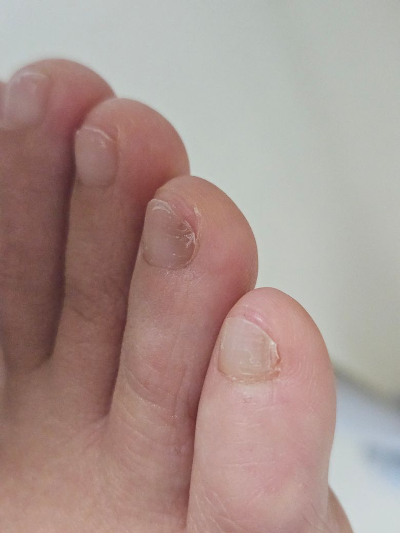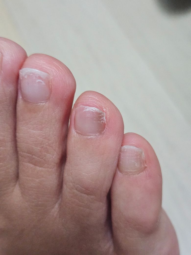 수개월전 조이는 신발 신고 네번째 발톱이 아팠습니다. 그즈음 발톱 색이 멍든것 같이 보여서 멍들었구나 생각하며 지냈는데 발톱이 자라도 저 끝 라인은 계속 검은색이네요