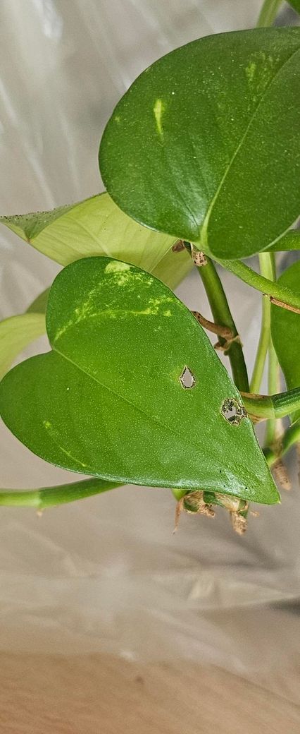 키우던 스킨답서스에 구멍이 뚤려있는데, 벌레가 생긴걸까요? 만약 그렇다면 어떻게 해야하나요?