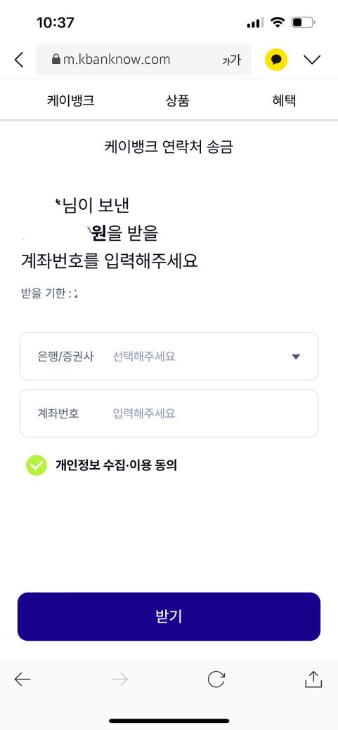 아는 사람이 제게 돈 입금을 해줘야 할게 있어서 입금해준걸 기다리고 있었는데 카톡으로 연락이 오더라구요? 당연히 카카오뱅크로 입금을 해준줄 알았는데 알고보니 케이뱅크라는 앱으로 입금을 해준것 같아요..! 근데 제가 케이뱅크 앱 자체를 안 쓰고 있는데 입금을 받으려면 계좌를 입력해야 하나요?1. 케이뱅크 앱으로 카카오톡으로 보낼 수 있는건가요?
