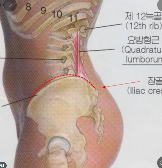화살표 아래부위가 장골능이라고 하는 iliac crest이고 그 윗 부분에는 뼈가 없어지면서 움풀 들어가는것처럼 보일 수 있습니다.