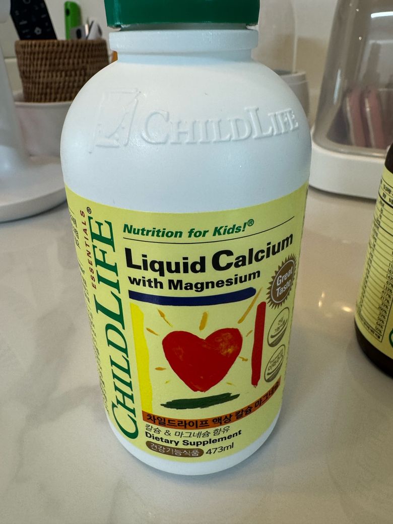 저녁 식사 후 : 차일드라이프 칼슘마그네슘 10ml에 닥터에디션 비타민D 2방울(800IU) 섞어서 섭취