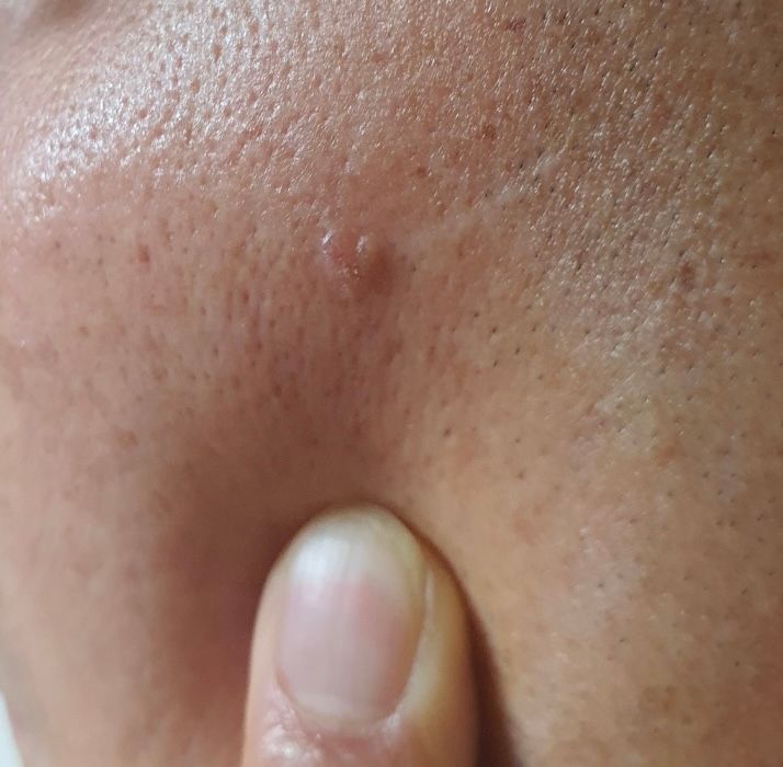 오늘보니 얼굴 왼쪽 관자놀이 아래 볼쪽에 갑자기 볼록 튀어나온게 생겼습니다 피부랑 비슷한 색이고 통증은 없어요 이게 무엇일까요? 병원에 가야할까요?