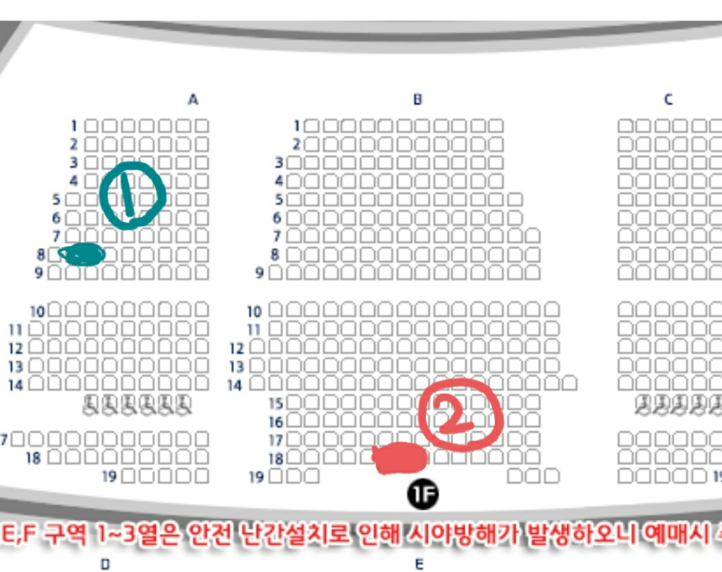 마포아트센터 아트홀같은데는 왼쪽이나 2번이나 크게 상관은 없으실건데 쾌적하게 보실거면 2번쪽이 나을겁니다.