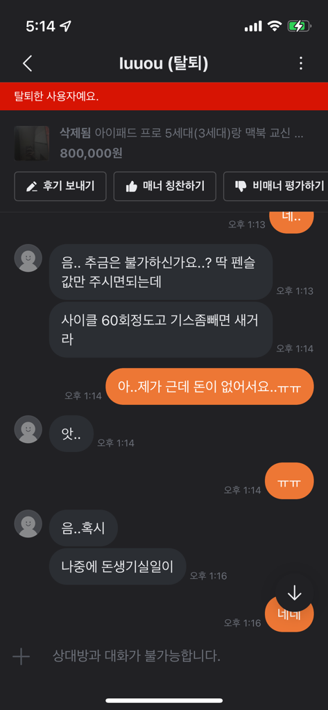 안녕하세요 저는 얼마전 당근마켓이라는 어플로 제 아이패드 프로 11형 3세대와 상대방의 물건 맥북 프로 2020년도 13인치와 제가 13만원의 추금을 주고 교환을 하였습니다. 거래를 하는 도중 상대방이 먼저 사이클 60회 잔기스 빼곤 새상품이라고 말 하였고, 저도 하자를 천천히 사진을 찍어 보여드렸습니다. 그리고 나서 바로 직거래를 하자고 만났고 상대는 처음부터 화면을 열고 있던 상태에서 만났고 상품 설명을 해주실때도 하자는 말도 안하다가 제가 집에 와서 하자를 발견 했습니다. 하지만 저는 그냥 참고 있으려고 했고, 충전기가 없어 맥북이 방전 위기여서 그분께 충전기를 부탁하였습니다 근데 충전기를 당근마켓에 떡하니 올려두곤 없다고 하셔서.. 당황했긴 했는데 제가 그럼 아이패드 충전기라도 주실 수 있냐는 질문에 아이패드를 팔았다고 합니다 당근마켓은 탈퇴한 상태에서요. 그래서 제가 너무 거짓말이 의심이 들어서 미기재했던 하자를 보여드렸습니다 이거 부분 환불이 가능할까요?