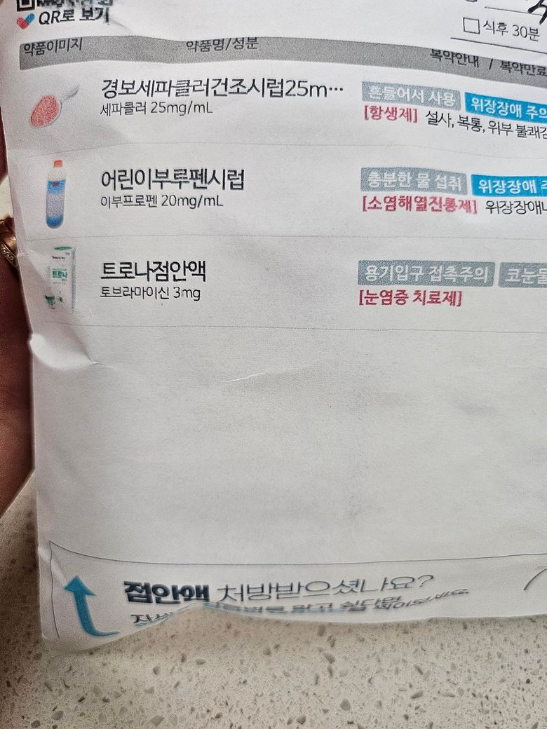 처방받으신 세파클러, 부루펜, 트로나점안액은 해당 성분들과의 상호작용 우려가 낮으므로 다래끼 치료를 위해 중단 없이 끝까지 복용과 점안을 이어가시기 바랍니다.