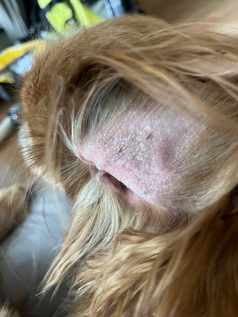 더이상 긁지 않게 넥칼라를 착용해주시고 병원 가서 진료와 내복약 받으시기 바랍니다.