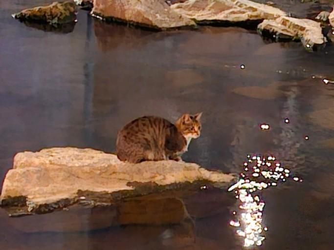 하지만 물을 싫어하는 고양이도 물고기에 대한 호기심 때문에 강이나 호수에 내려오고 물 한가운데 솟은 돌 위에 올라서 기웃거리기도 하더라고요.