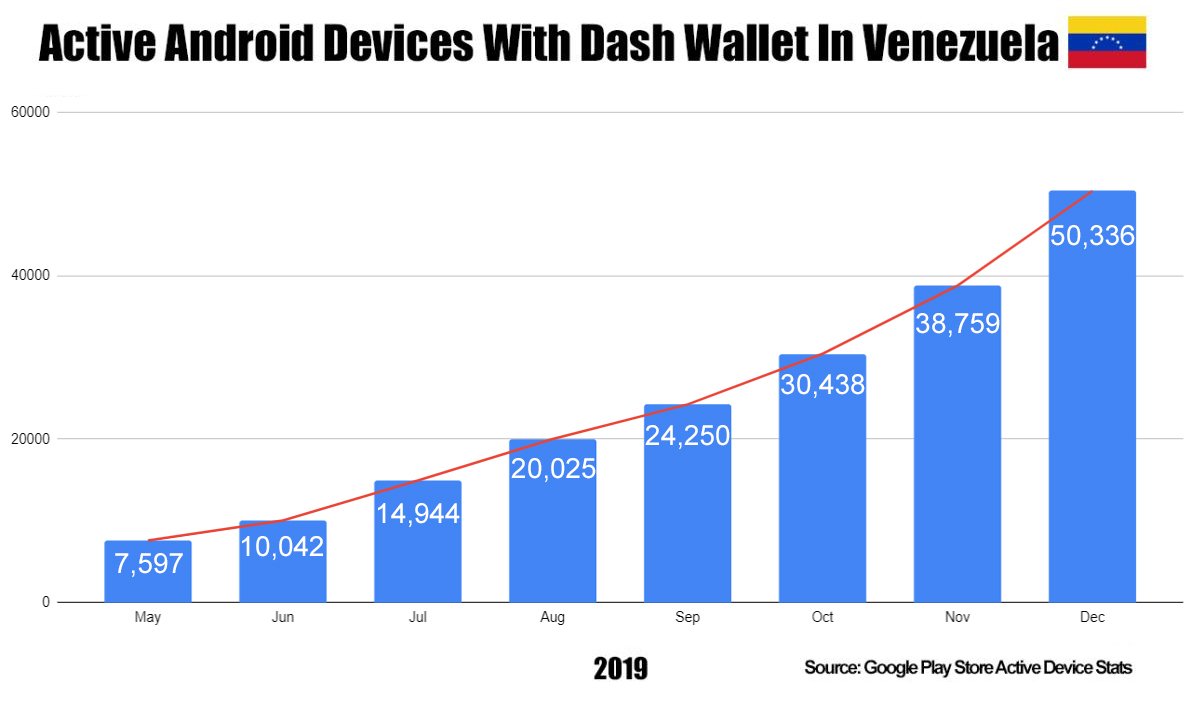 그런데 대시의 경우 베네수엘라에서 상당히 활발하게 사용되고 있습니다. 지난 2018년에 대시의 CEO인 라이언 타일러는 베네수엘라가 세계에서 두 번째로 큰 시장이라고 밝힌 바가 있고, 대시의 공동창립자인 마크 메이슨의 트윗에 따르면 작년 5월부터 12월까지 베네수엘라에서 대시 지갑 앱을 사용하는 활성화된, 안드로이드 기기가 562%나 증가했다고 하며 12월에만 29% 성장했다고 합니다. https://twitter.com/StayDashy/status/1219355943479185414?s=20