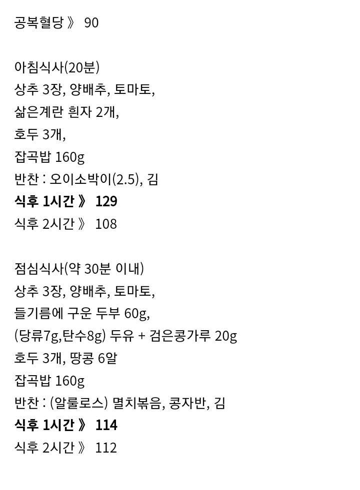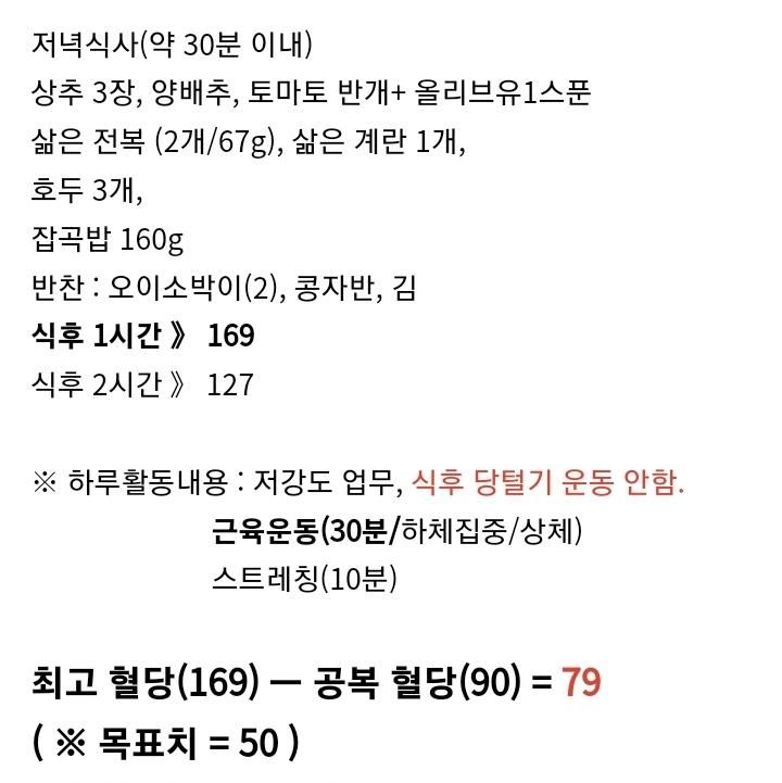 참고로 운동은 점심 식후2시간까지 완료하고 2시간 혈당쟀습니다. 유산소없이 근력으로만 30분 채웠고, 평소 근력운동의 1.5배 늘린 수준입니다. 운동후 30분~1시간 내에 졸음이 밀려와서 낮잠자고 바로 일어나서 30분~1시간 내로 식사 시작했슴다.