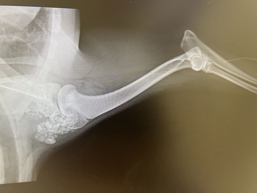 상완골의 수질부 밀도가 근위 metaphysis부근, 원위부 영양공의 근위 부분으로 부분적인 증가 양상을 보이고 있어 범골염 가능성도 같이 보이고 있습니다.