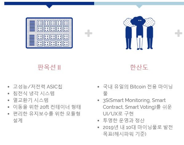 업계 최초로 11나노 공정 ASIC을 채용한 고성능/고효율의 하드웨어인 ‘판옥선II’를 개발하는 동시에, 투명하고 공정한 분배를 위해 국내 유일의 자체 마이닝 풀인 ‘한산도’를 개발하고 오픈을 준비하고 있습니다.