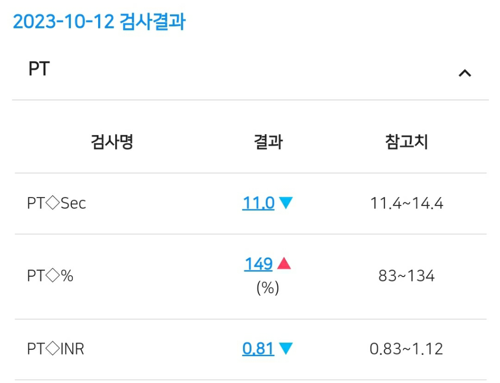 PT Prothrombin Time은 혈액이 얼마나 빨리 굳는가를 측정한 것입니다