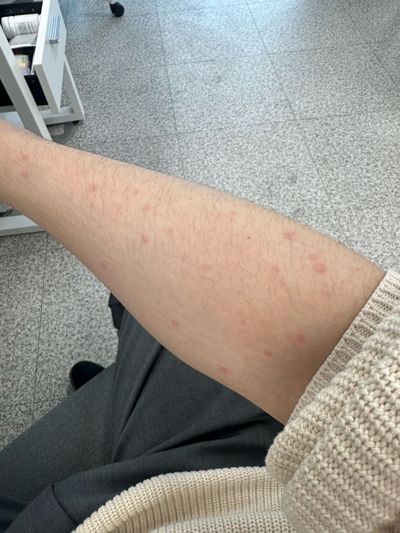 사진상 전완부에 다발성 홍색 구진이 산재해 있고, 크기는 수 밀리미터 정도로 보입니다. 수시간에서 하루 이내에 나타났다가 사라지는 양상이라면 고정된 발진보다는 일시적 염증 반응 가능성이 높습니다.