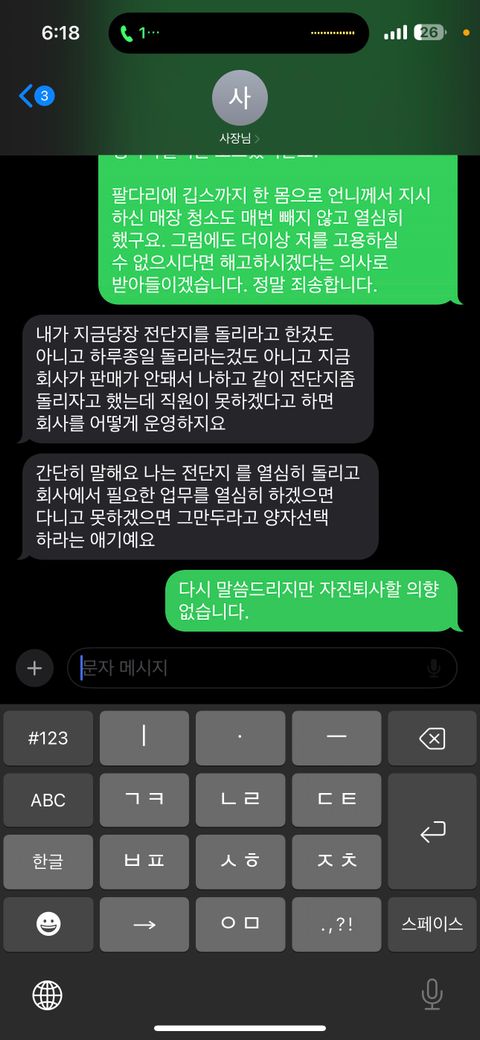현재 자진퇴사 할 의사가 없다고 확실하게 전달드렸으나, 전단지 추가업무를 하지 않을거면 그만둔다고 말하라며 계속해서 자진퇴사를 강요하시는 중이구요.