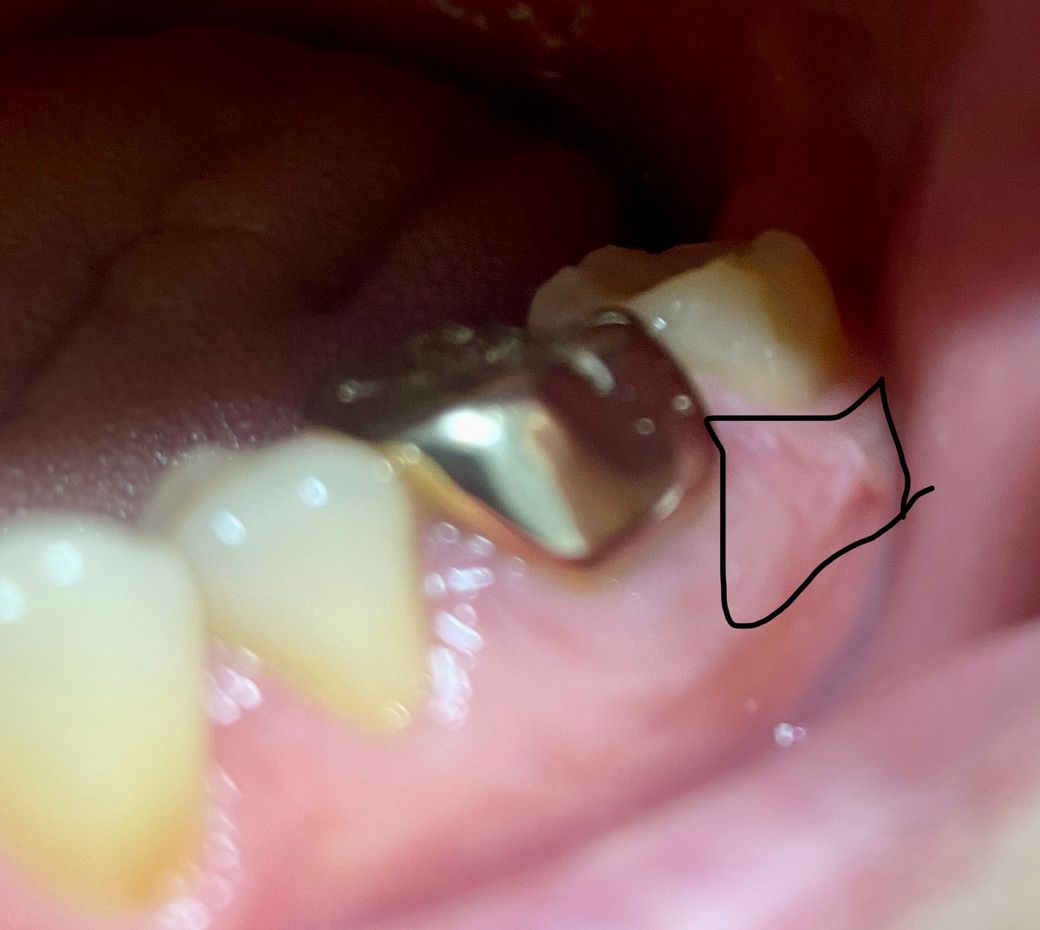 사진에 보이는 것처럼.. 약간 하얀색으로 오른쪽 밑 어금니 아래 잇몸 부분이 변하면서