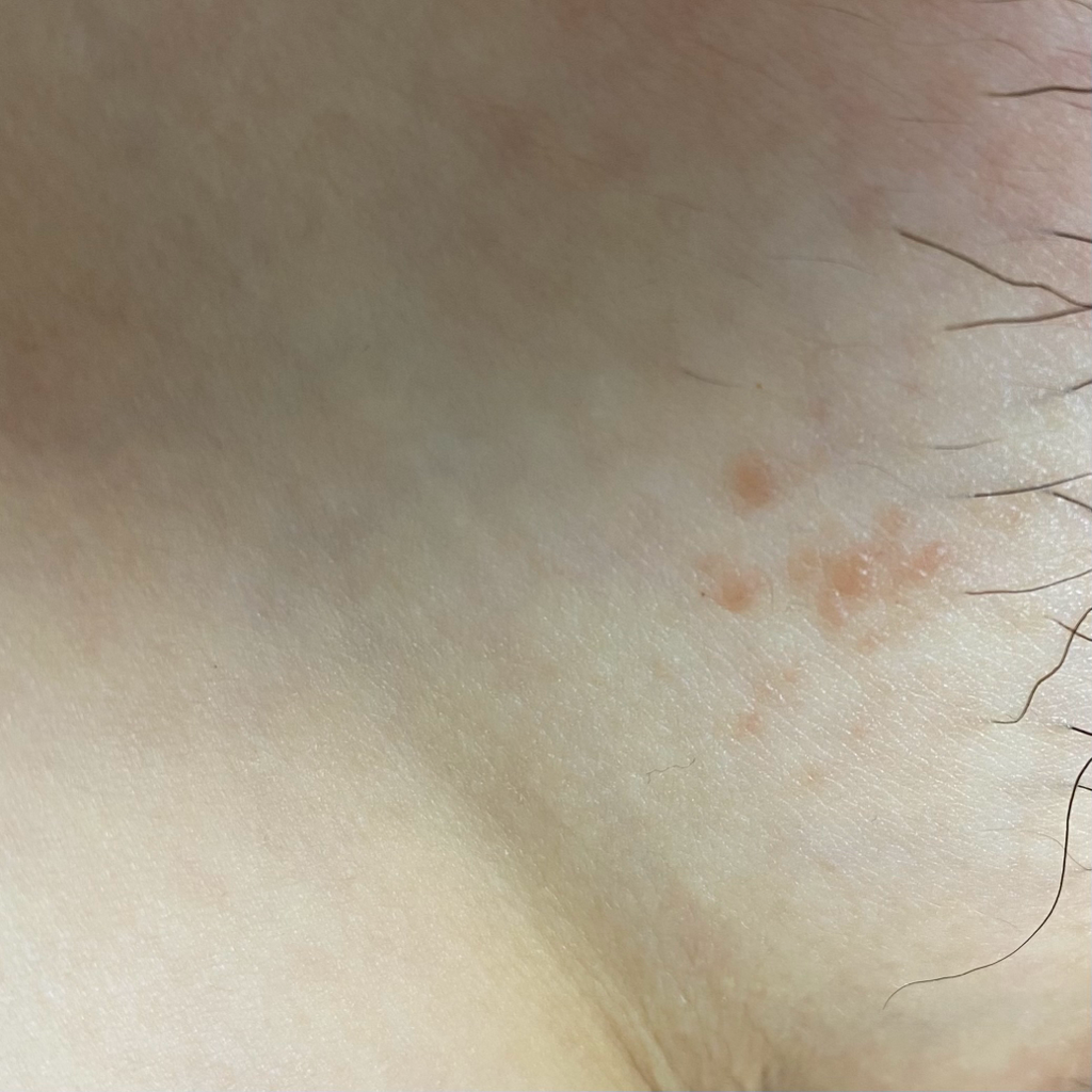 땀띠나 알레르기 반응일 수 있겠는데 잘 씻고 완전히 건조시킨 뒤 보습제를 잘 발라주시는 것으로 호전을 기대해볼 수 있겠고, 점점 번져간다면 피부과 진료 후 약을 사용해야 합니다.