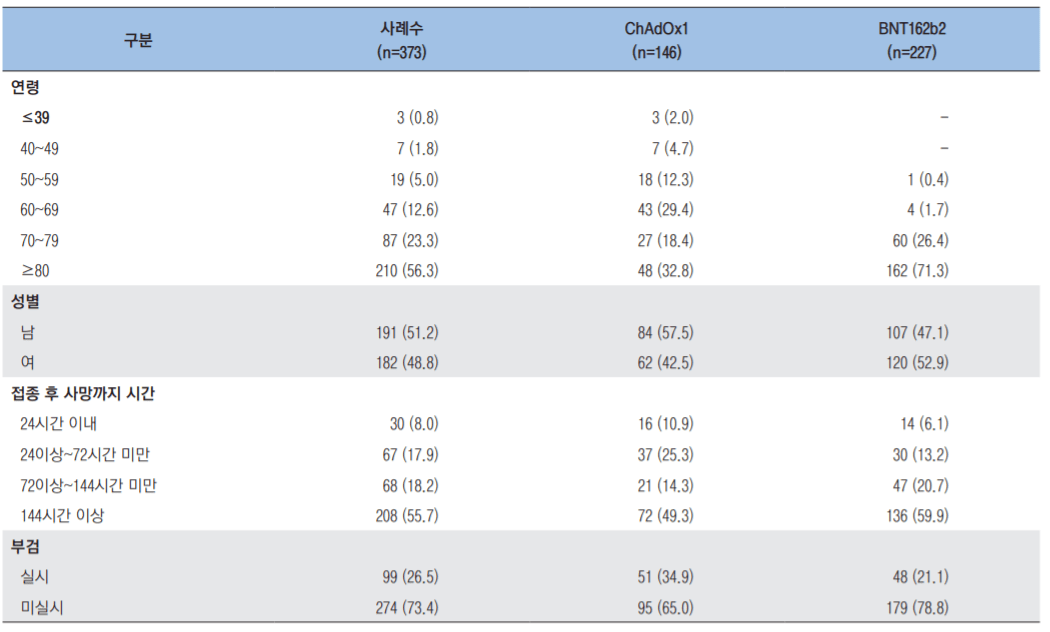 표 1. 코로나19 예방접종 후 사망 사례의 특성