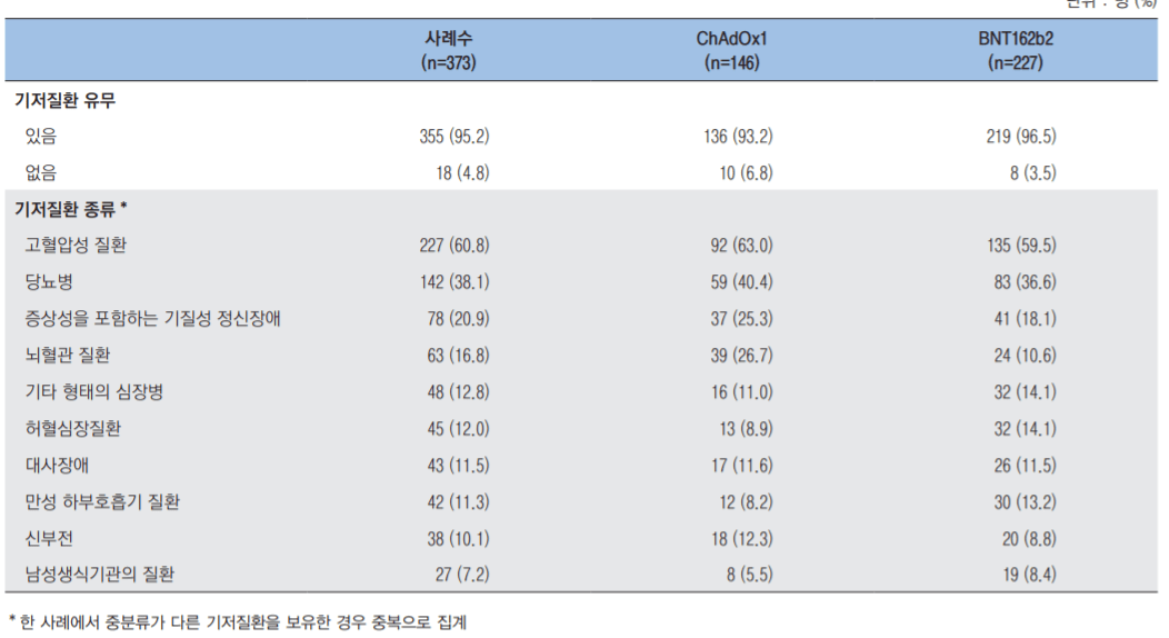 표 2. 코로나19 예방접종 후 사망 사례의 기저질환