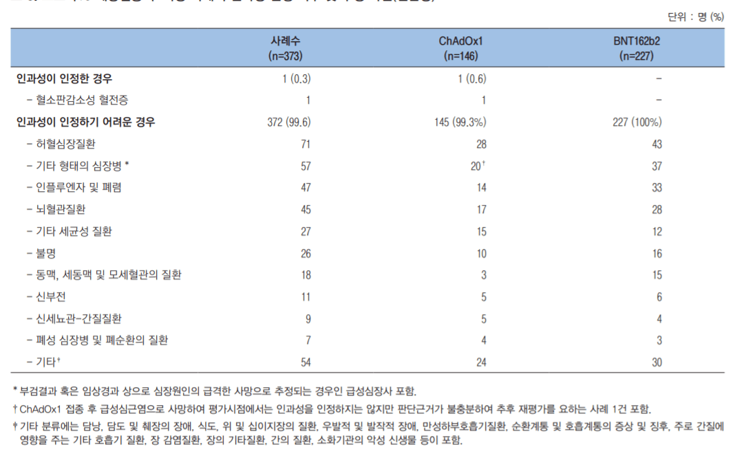표 3. 코로나19 예방접종 후 사망 사례의 인과성 인정 여부 및 추정 사인(진단명)