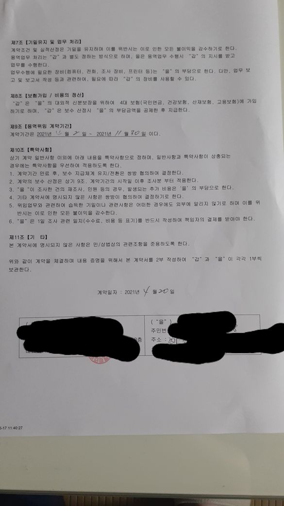 현재 손해사정 법인에서 농작물 손해사정 업무를 하고 있습니다. 작년까지 다른 곳에서 동일업무를 하다가 이 곳 직원의 권유로 입사했습니다. 저 말고도 2명 더 있구요, 그 중 한명이 근로계약서 작성을 요구해도 이를 거부하고 용역계약서를 작성하도록 요구하여 현재는 용역계약서를 작성한 상태입니다.